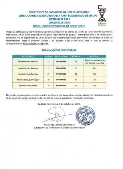 Resolución provisional de solicitudes de cambios de grupo para el primer semestre. Plazo extraordinario para equilibrado de grupos.