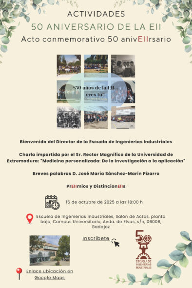 Como sabes, la Escuela de Ingenierías Industriales (EII) se encuentra, en el periodo comprendido entre el 15 de octubre de 2024 y el 15 de diciembre de 2025, en el año de su 50 aniversario, contando con un ambicioso programa de actividades previstas para este periodo. Por esto motivo, el próximo miércoles 15 de octubre a las 18:00 horas en el salón de actos de la planta baja de la EII, se celebrará un Acto Conmemorativo de este 50 aniversario, en el que nuestro Sr. Rector nos impartirá la conferencia: «Medicina personalizada: De la investigación a la aplicación» y, tras unas palabras de nuestro querido antiguo Director D. José María Sánchez-Marín Pizarro, se procederá a una entrega de PrEIImios y DistincionEIIs.
