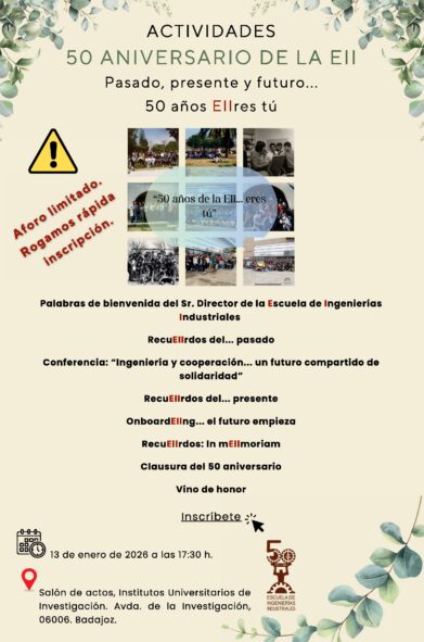 Como seguramente sepas, la Escuela de Ingenierías Industriales (EII) ha estado, en el periodo comprendido entre el 15 de octubre de 2024 y el 15 de diciembre de 2025, en el año de su 50 aniversario, contando con un ambicioso programa de actividades previstas para este periodo de conmemoración.